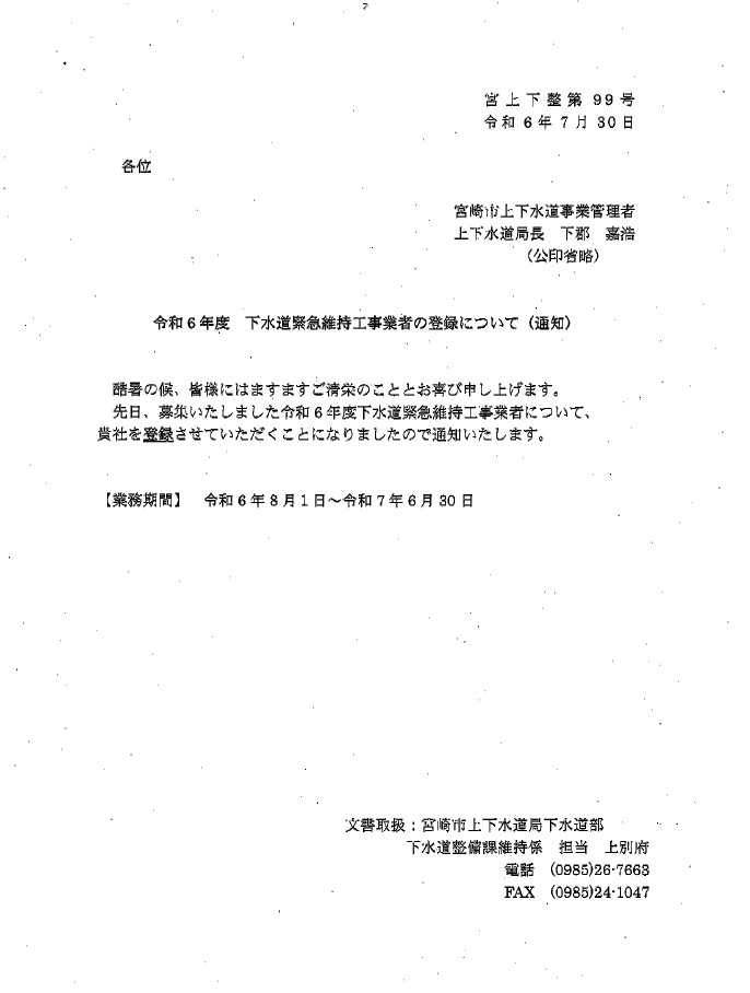 令和6年7月31日 宮崎市の令和6年度下水道緊急維持工事業者に登録されました。